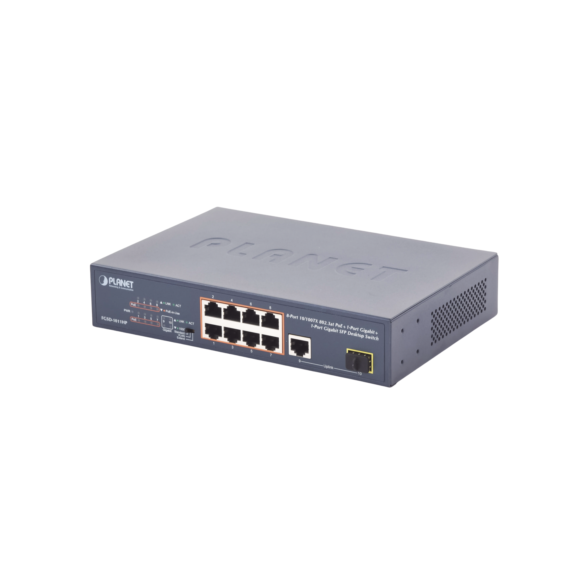 FGSD-1011HP|Switch no Administrable 8 puertos 10/100 PoE 802.3af/at 135W, 1 puerto Uplink 10/100/1000 y 1 SFP 100/1000 para escritorio